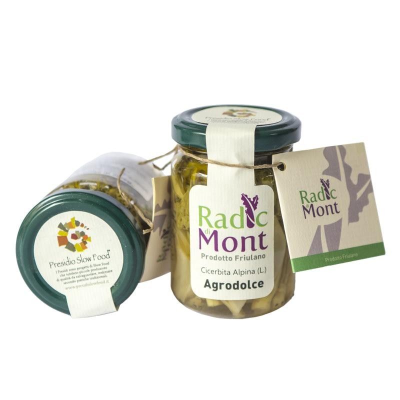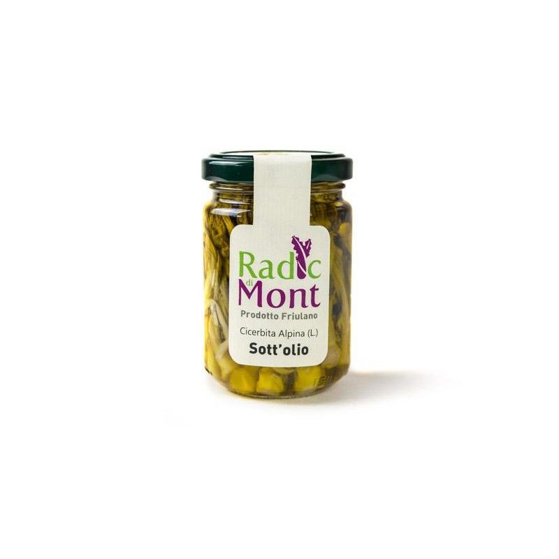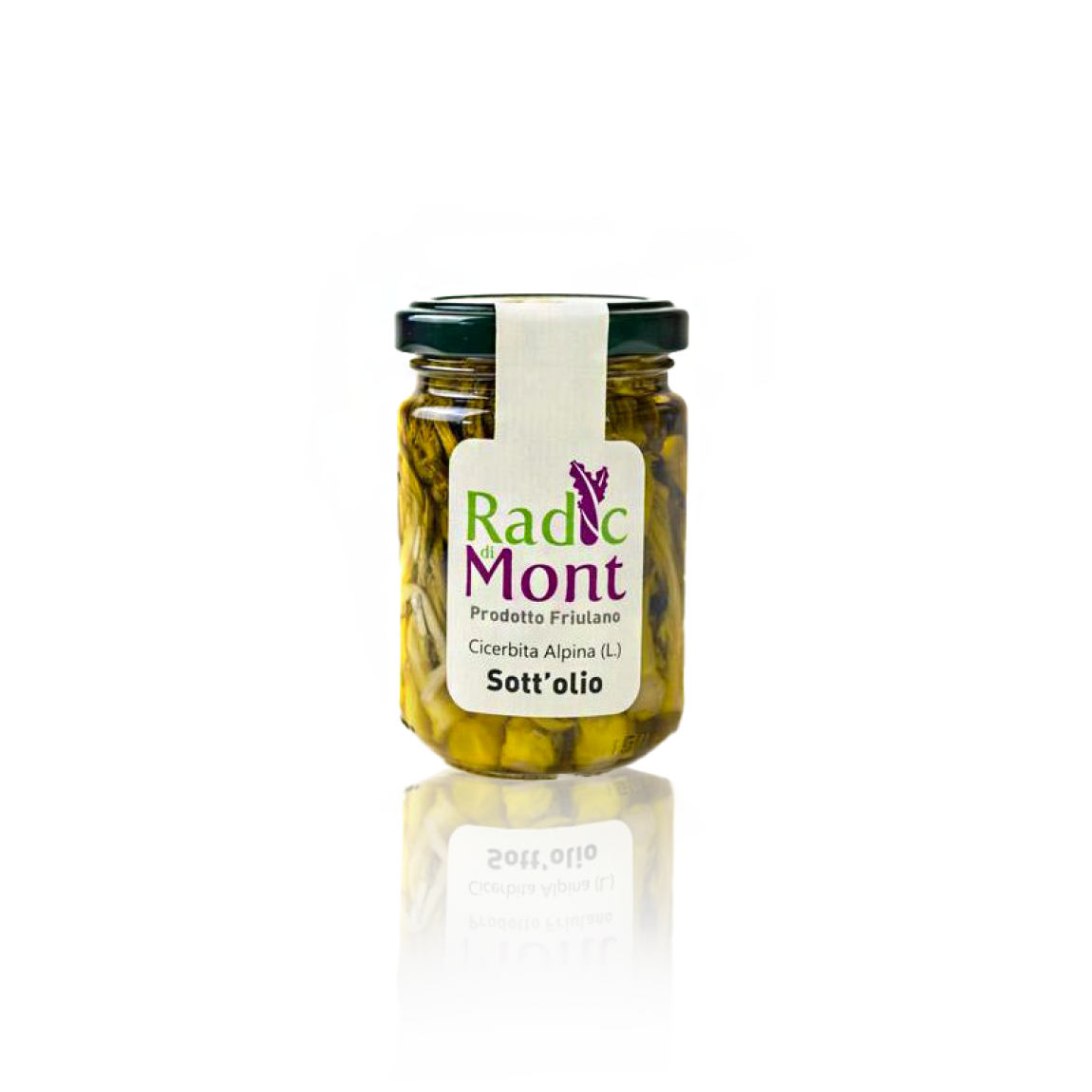 Germogli di radicchio di montagna (Cicerbita alpina o Lactuca alpina), chiamata tradizionalmente in Friuli “Radic di Mont”.I germogli sono raccolti in tarda primavera allo sciogliersi delle nevi, in ambienti di boscaglia rada e in ripidi canaloni in montagna, a quote elevate delle Alpi Carniche del Friuli-Venezia Giulia.